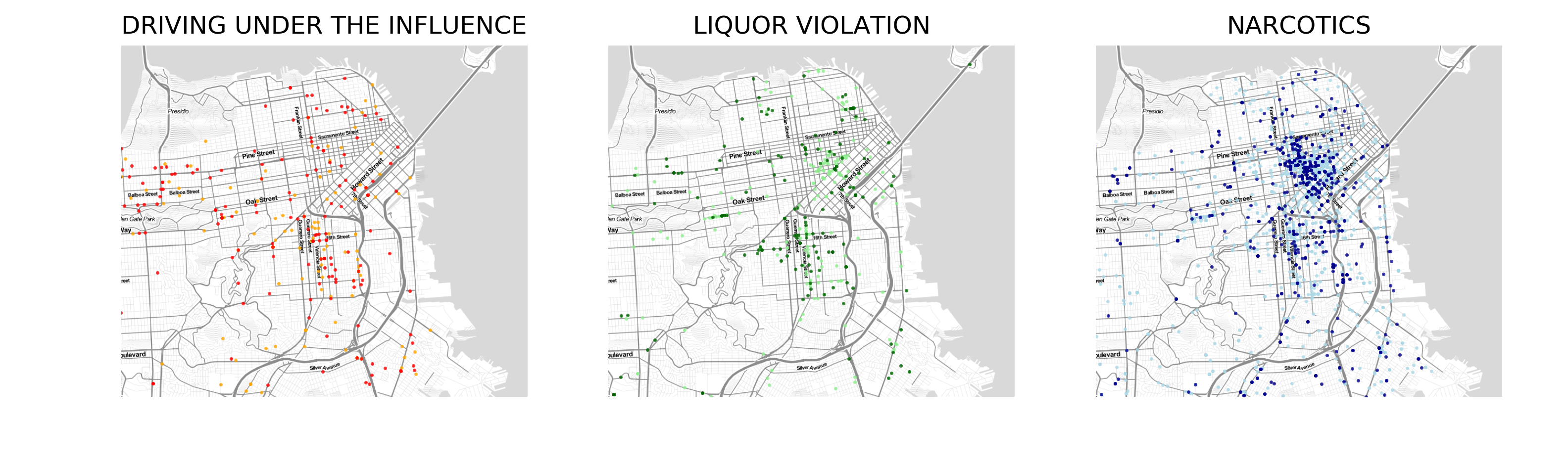 In Seattle, “Driving under the Influence” and “Narcotics” dominate in the CBD and the few reported incidents of “Liquor Violation” also occur in this area, although the small sample size makes a good interpretation difficult.